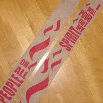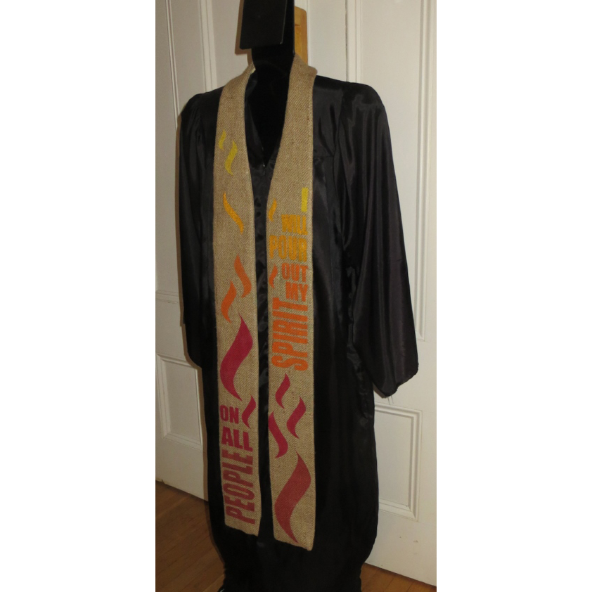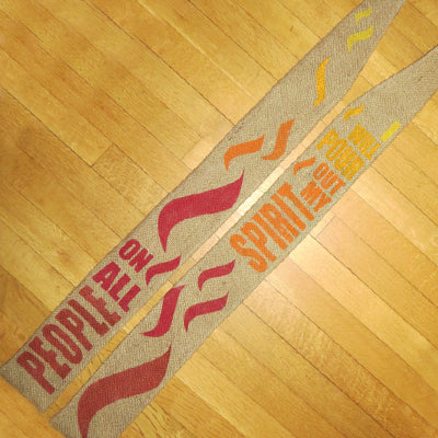 "I will pour out my spirit on all people" is hand painted on this stole in either solid red or a gradation from yellow to orange to red. This phrase is from Peter’s address to the crowd on Pentecost in Acts 2:17, recalling the words from Joel. The text weaves from the right to the left side, surrounded by flames. The color and design of this stole make it a wonderful choice for Pentecost, ordination, or installation. Note that the amount of space above and below the design and the number/placement of the flames may be slightly different than pictured, depending on the length of the stole you order; additionally, the exact shades of yellow, orange, and red may be adjusted to best complement the burlap.